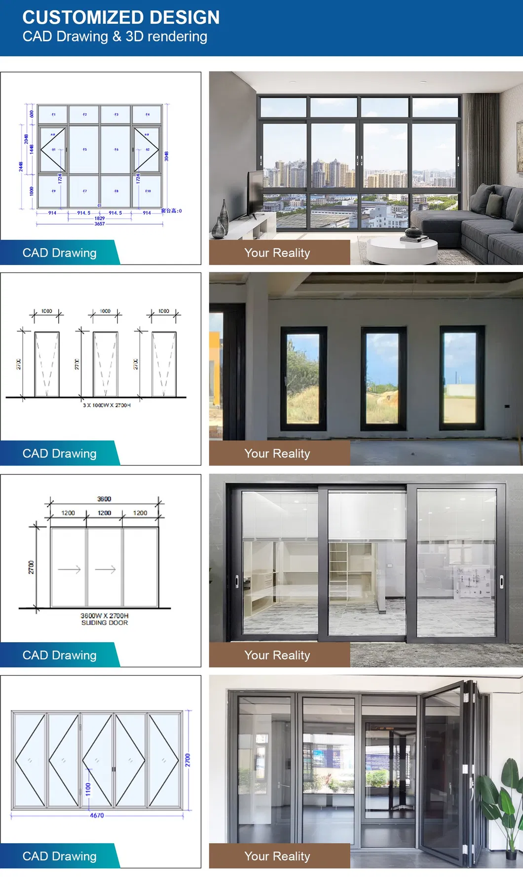 | Frame Color | Customized (Black, White, Grey, Bronze, Champagne, Sliver, etc) |