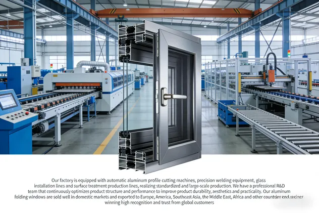 We are a professional aluminum doors and windows manufacturing factory, focusing on aluminum alloy folding systems. Our production base features advanced automatic cutting machines, precision welding equipment, and glass installation lines. We operate under a strict quality control system covering raw material procurement to final inspection.